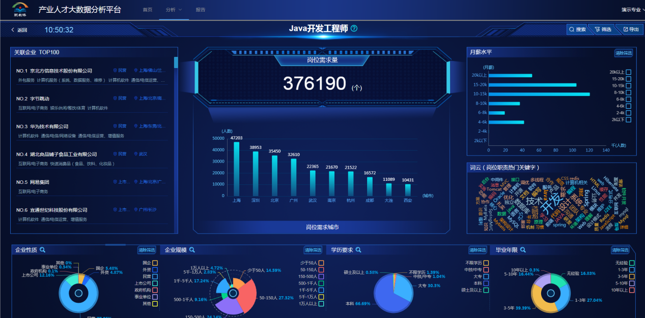 - 平台数据自动清洗、抽取、预处理、建模形成各类可视化分析图表,方便快速阅读、理解数据。内置成熟的 OLAP 联机分析处理引擎,构建强大的数据计算能力,帮助快速、轻松地掌握数据中的含义,对各类数据的统计、钻取、分析和挖掘,分析数据内在关系,深度洞察行业人才供需趋势。