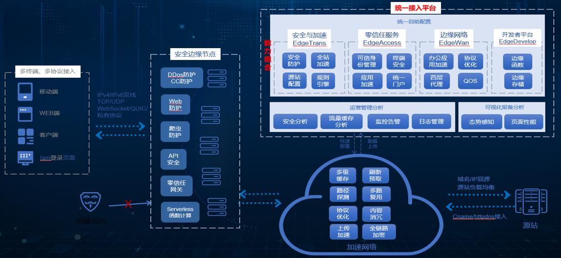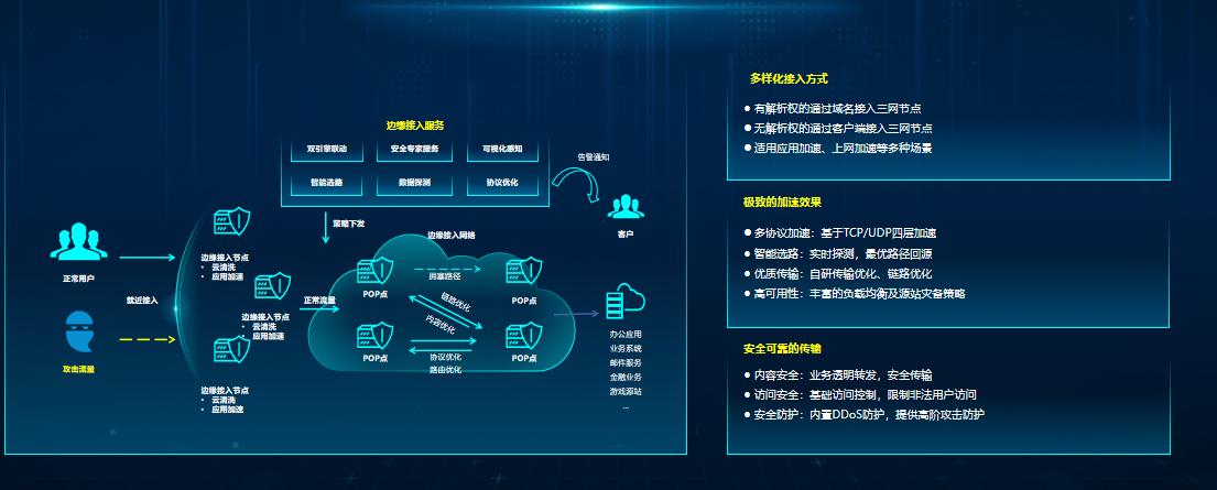 边缘接入服务基于优质的边缘网络资源和应用安全加速能力,为企业网络提供安全、高性能网络连接。客户可以将任意位置的数据资源安全连接到边缘网络入口,通过高速通道、智能路由及安全防护技术,实现数据高速、稳定、安全的跨地域传输,帮助客户解决全球访问卡顿、延迟过高问题,为客户快速集成一个交付即用、按需弹性且安全的网络环境。