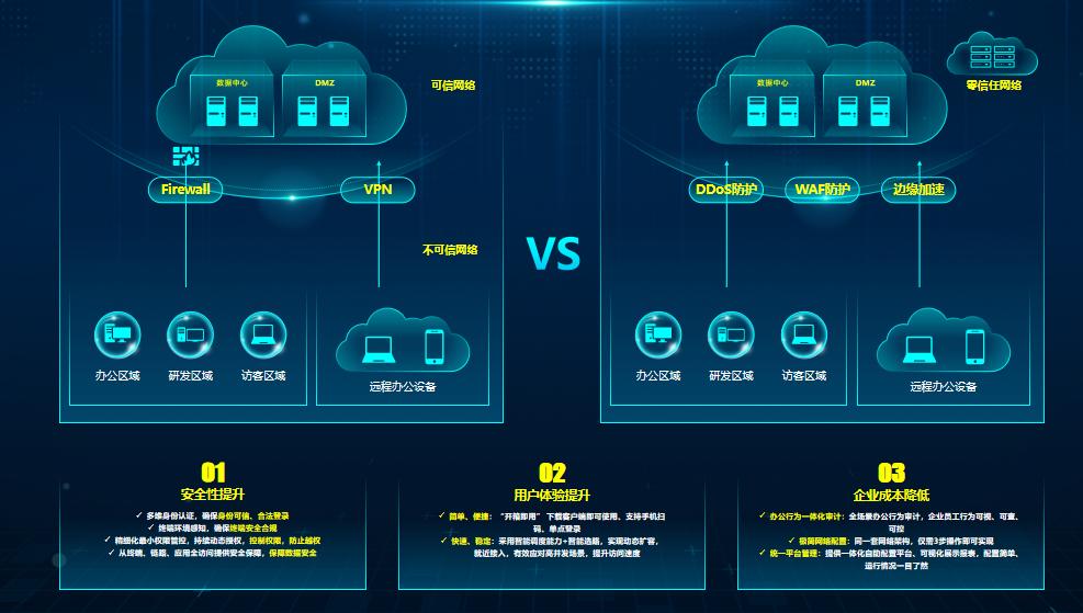 区分传统架构接入即“默认可信”,零信任采用全新方案,专注于“2个提升+1个降低”,为企业提供全新的企业安全接入方案。