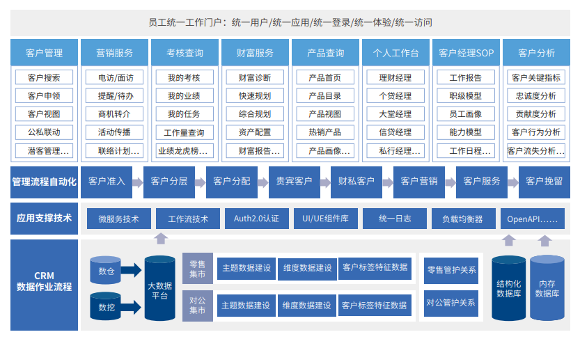 CRM系统是面向银行业务管理人员、客户经理、网点主管角色,集客户信息管理和服务营销为一体的客户关系管理系统。在整合各业务系统以及各渠道系统客户数据的基础上,建立供全行共享的客户信息数据库,实现客户统一视图;以客户为中心,建立全面的客户评价机制,实现客户细分;在细分客户基础上发现目标客户,挖掘已有客户,制定营销方案,实行差别化服务。从而提升银行产品、服务品质和销售能力,完成对客户的全面分析,加强客户管理,降低资产风险,减轻客户经理的日常工作负担和压力,提高客户关系管理水平。