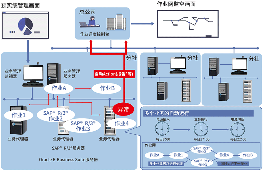 即使主机分散在不同的地域,也能够实现业务的自动运行,并且可以集中在一台主机的画面中进行操作和监视,大大减少所需人手,从而达到削减成本、最大限度利用人力资源的效果。