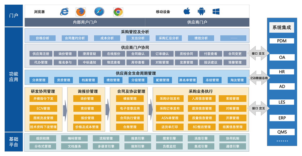 实现采购业务流程的统一平台化管理,保证企业采购与生产、质量、仓储、财务等部门的业务协同化,提高企业内外部的信息交互速度,及时响应市场需求。