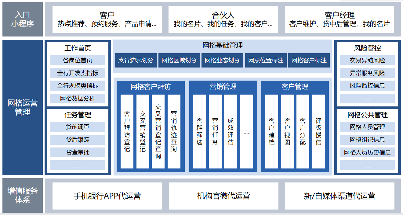 • 构建网格营销的主要目标是便于按照地理区域的分区管理,实现金融服务的全覆盖、无缝隙,实现对客户信息更方便和精细化的采集与共享,实现营销人员对客户营销需求更明确的记录和跟踪,同时建立和明细网格营销人员的职责,实现对网格管理人员的定岗定责与工作任务跟踪,提升产品服务的覆盖率和滲透率。