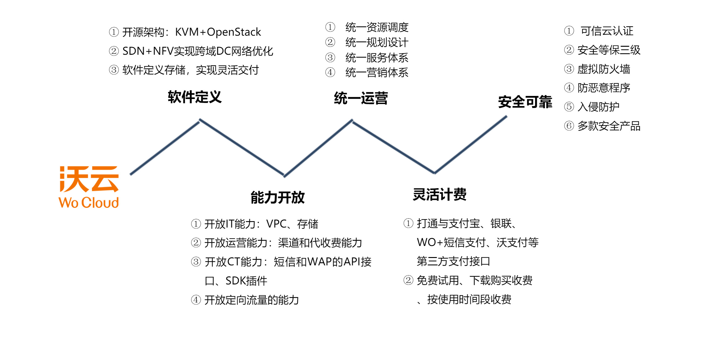 “沃·云”是联通集团推出的云计算业务,面向集团客户、行业客户和中小企业提供1+5+N(1电子政务云+5行业云+N个特色云)应用服务,可满足全国客户随时接入、随时扩展、按需使用、按使用付费的差异化需求,打造全新的云服务商业模式。